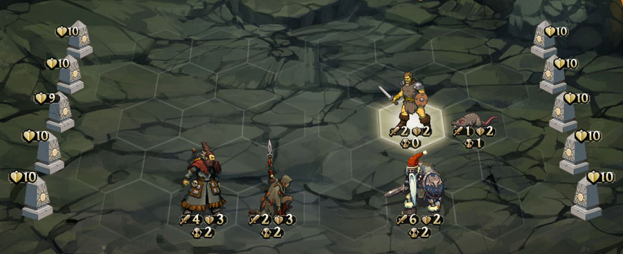 - เกมจะมีกระดานช่อง 6 เหลี่ยม (ผมนึกถึงฉากต่อสู้ในเกม Heroes) อยู่ตรงกลาง เรียกว่า battlefield ใช้สำหรับลงการ์ด โดยจะแบ่งเป็นฝั่งของเราและคู่ต่อสู้อย่างละครึ่ง โดยเราจะอยู่ทางฝั่งซ้ายเสมอ