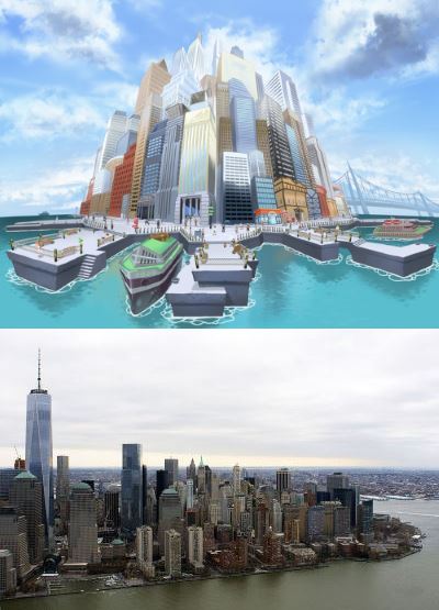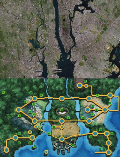 สถานที่สำคัà¸à¹† ที่à¸à¹‰à¸²à¸‡à¸à¸´à¸‡à¸¡à¸²à¸ˆà¸²à¸à¹‚ลà¸à¸ˆà¸£à¸´à¸‡à¹€à¸Šà¹ˆà¸™ Liberty Garden à¸à¹‰à¸²à¸‡à¸à¸´à¸‡à¸ˆà¸²à¸ Liberty Island (เà¸à¸²à¸°à¸—ี่มีเทพีเสรีภาพ), Mistralton City (เมืà¸à¸‡à¸ªà¸™à¸²à¸¡à¸šà¸´à¸™) à¸à¹‰à¸²à¸‡à¸à¸´à¸‡à¸ˆà¸²à¸à¹€à¸¡à¸·à¸à¸‡ Teterboro, New Jersey, Castelia City à¸à¹‰à¸²à¸‡à¸à¸´à¸‡à¸ˆà¸²à¸ Lower Manhattan เป็นต้น