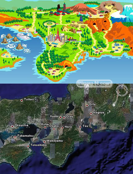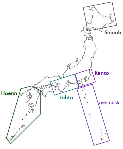 เริ่มจาà¸à¹€à¸à¸¡ 4 Gen à¹à¸£à¸à¸à¸±à¸™à¸à¹ˆà¸à¸™ (Red/Green/Blue/Yellow+Gold/Silver+Ruby/Sapphire+Diamond/Pearl) ภูมิภาคต่างๆ ในเà¸à¸¡ (Kanto, Johto, Hoenn, Sinnoh) จะà¸à¹‰à¸²à¸‡à¸à¸´à¸‡à¸ˆà¸²à¸à¸ ูมิภาค Kanto, Kansai, เà¸à¸²à¸° Honshu à¹à¸¥à¸°à¹€à¸à¸²à¸° Hokkaido ขà¸à¸‡à¸›à¸£à¸°à¹€à¸—ศà¸à¸µà¹ˆà¸›à¸¸à¹ˆà¸™ ตามภาพด้านล่าง