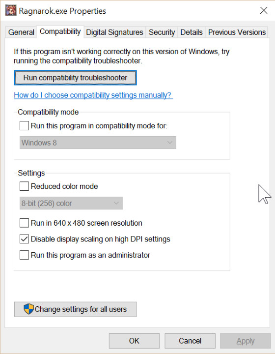 - ไปที่à¹à¸—็บ Compatibility à¹à¸¥à¹‰à¸§à¸•ิ๊à¸à¸–ูà¸à¸—ี่ Disable display scaling on high DPI settings à¹à¸¥à¹‰à¸§à¸„ลิภOK à¸à¸à¸à¸¡à¸²